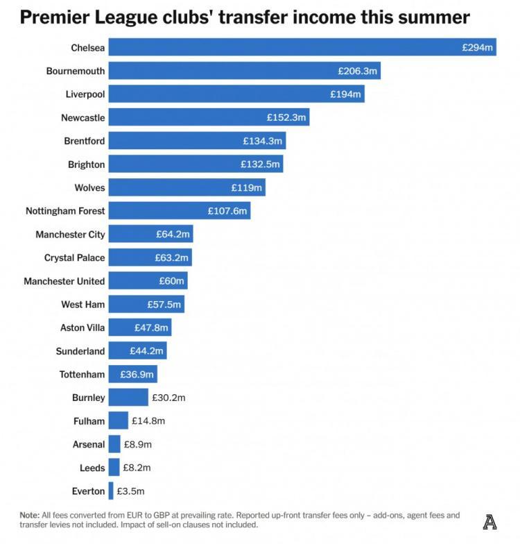 事实上,今夏只有切尔西和伯恩茅斯通过卖人赚得更多。