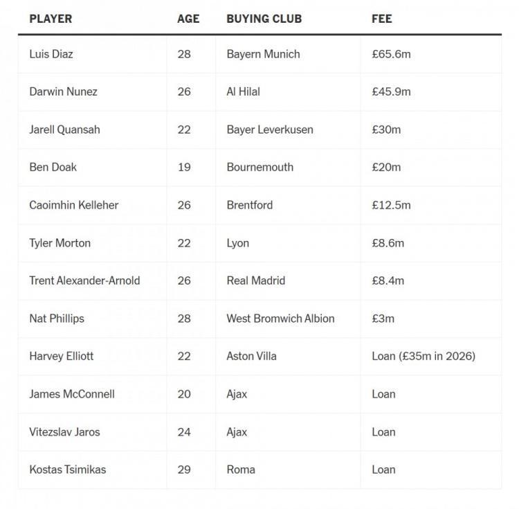 今夏利物浦12人以转会或租借形式离队,换回了1.94亿镑