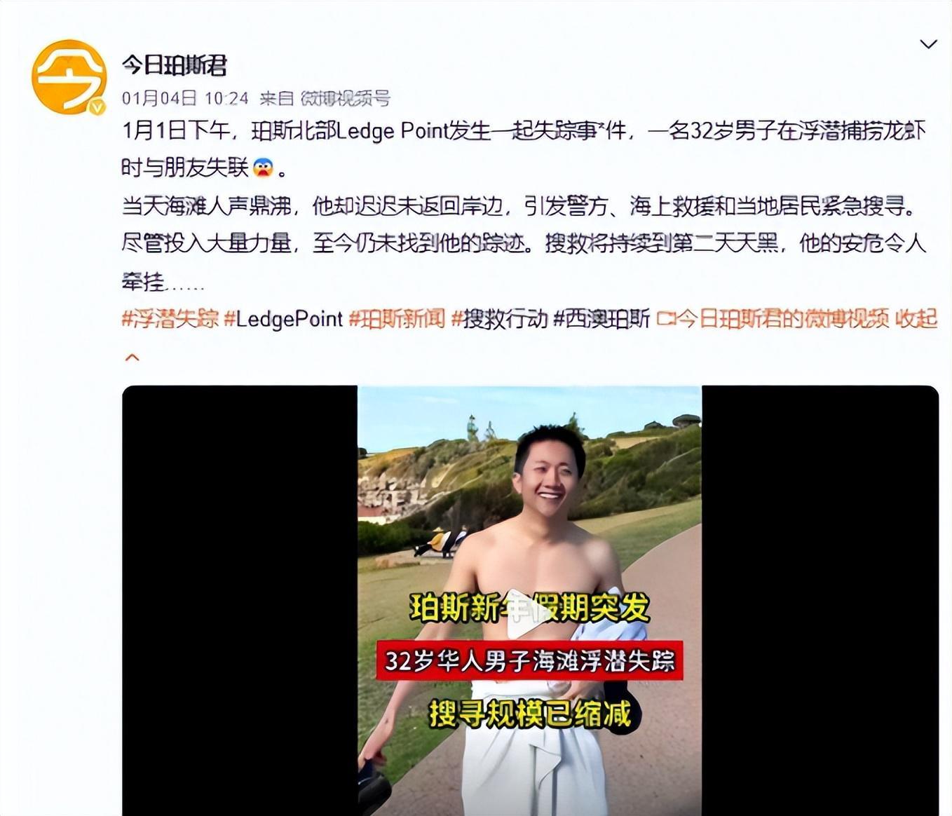 32岁中国男子在澳大利亚潜水捕龙虾时失踪,5日后有人在失踪地附近发现一头颅,当地警方回应---2026-01-08----滨州传媒网