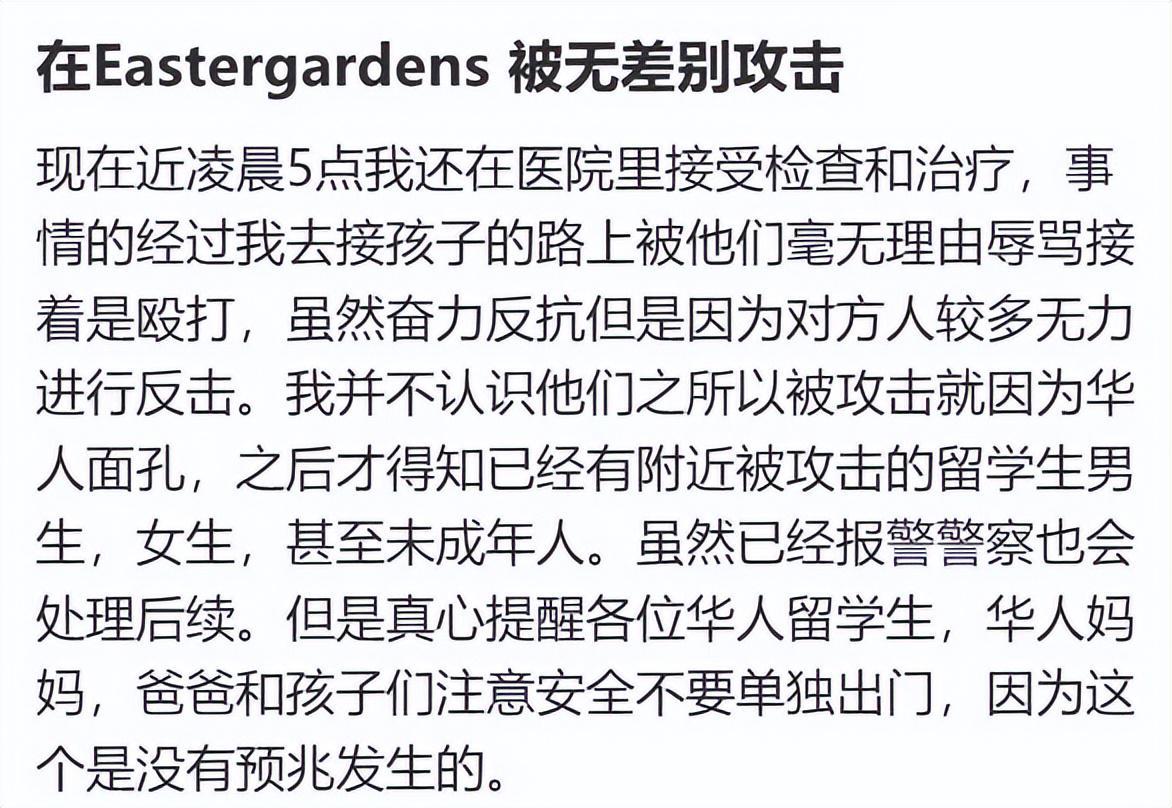当时事发时是一对中国留学生夫妇正在日常散步,可走着走着就被一群看起来仅有十几岁的澳洲少年,毫无征兆攻击女留学生。